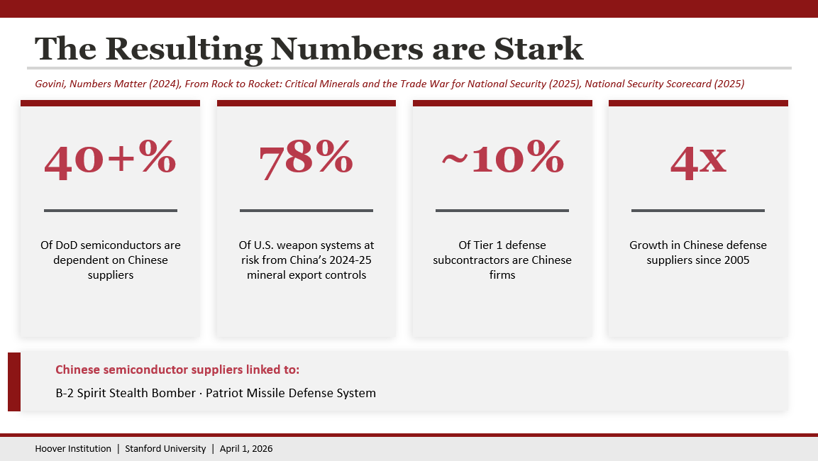 The consequences of these dependencies and existing policies are stark. Data from Govini, which is an analytics firm that works directly with Department of Defense procurement records, show that over 40 percent of the semiconductors sustaining DoD weapons systems depend on Chinese suppliers. 78 percent of U.S. weapons systems contain components with gallium, germanium, antimony, tungsten, or tellurium (i.e., minerals all subject to Chinese export controls between 2024 and 2025). Roughly one in ten Tier 1 defense subcontractors is a Chinese firm, and the number of Chinese suppliers in the defense industrial base has quadrupled since 2005.